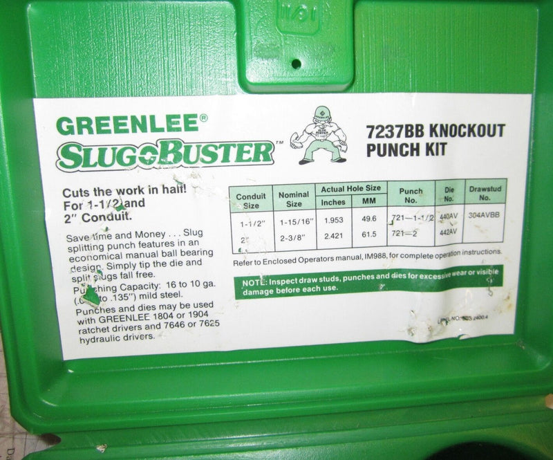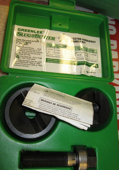 The 7237BB Greenlee Communications Slug Buster Knockout Punch Kit features 1-1/2" & 2" conduit sizes with 1.951" & 2-3/8" hole sizes. Knockout Kit has a capacity of 10-gauge (3.5-mm) mild steel but also cuts aluminum, fiberglass and plastic. The Greenlee Punch Set includes 1-1/2" conduit punch and die, 2" conduit punch and die, 3/4" conduit draw stud in a high-impact, rugged plastic carrying case.