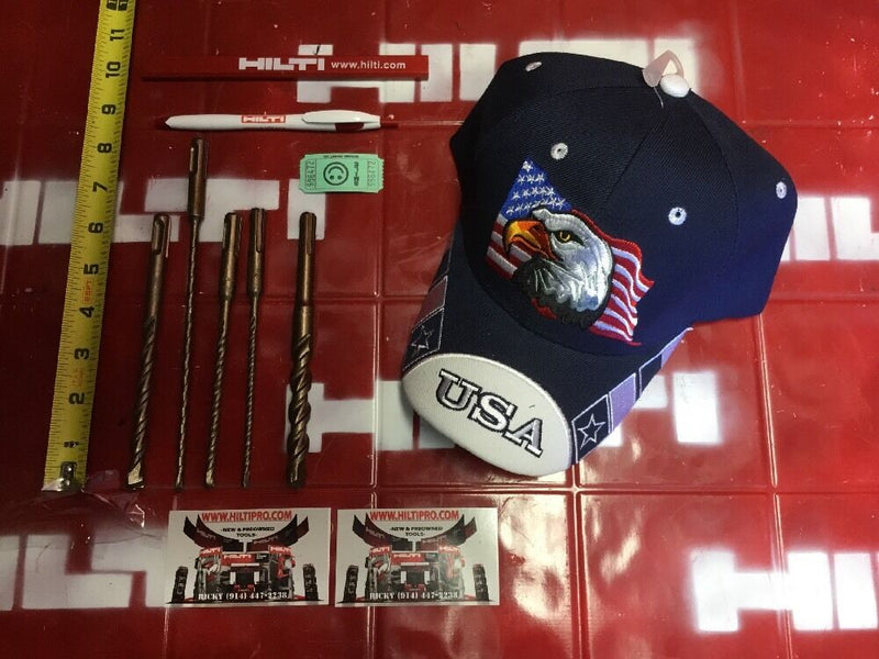 THIS HILTI SET OF 5 BITS IS PREOWNED, BUT IN MINT CONDITION! I HAVE NEVER USED THESE BITS. IT HAS SOME LIGHT WEAR FROM BEING ON THE SHELF. BUT OTHERWISE THEY ARE PERFECT AND READY FOR USE. THESE BITS ARE HEAVY DUTY AND WILL LAST YOU A LONG TIME JUST LIKE ANY OTHER HILTI. WE ARE INCLUDING A FREE BRAND NEW HILTI PEN, PENCIL AND HAT!
