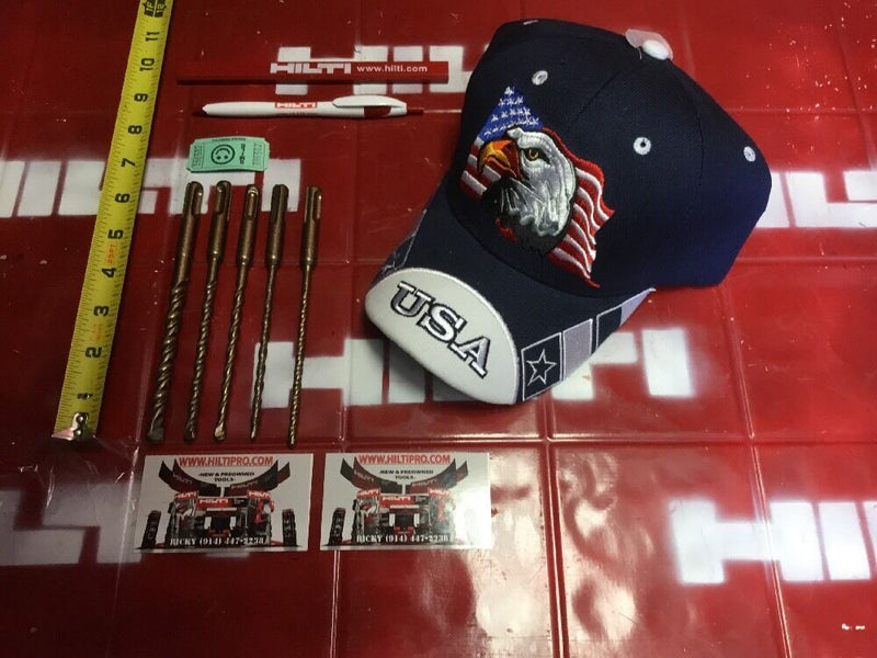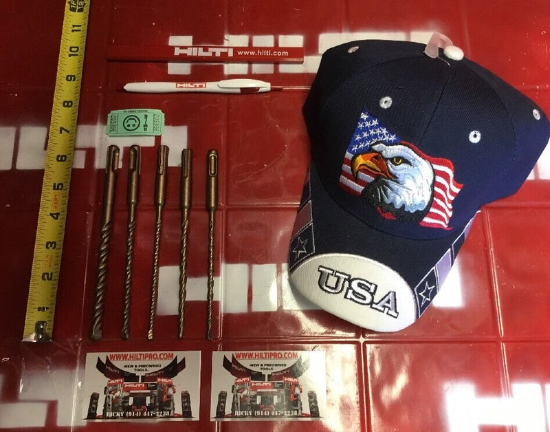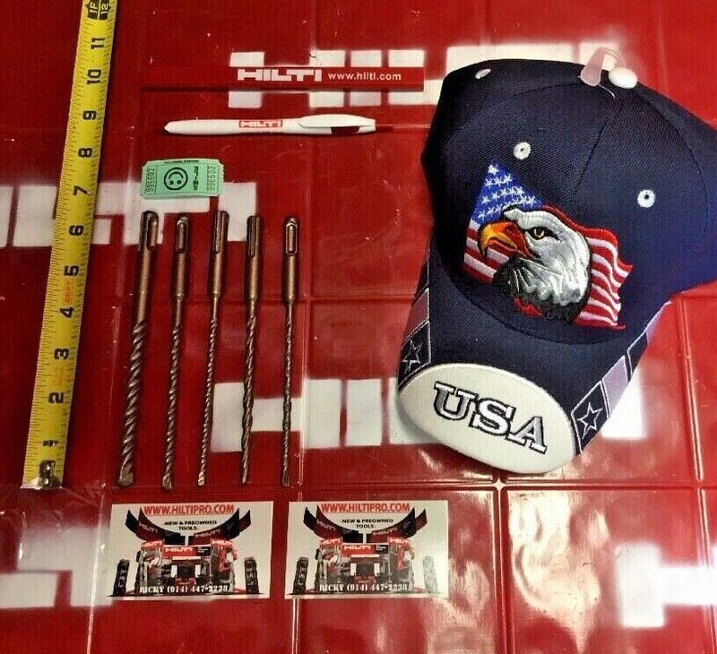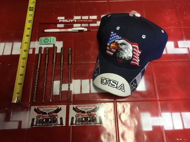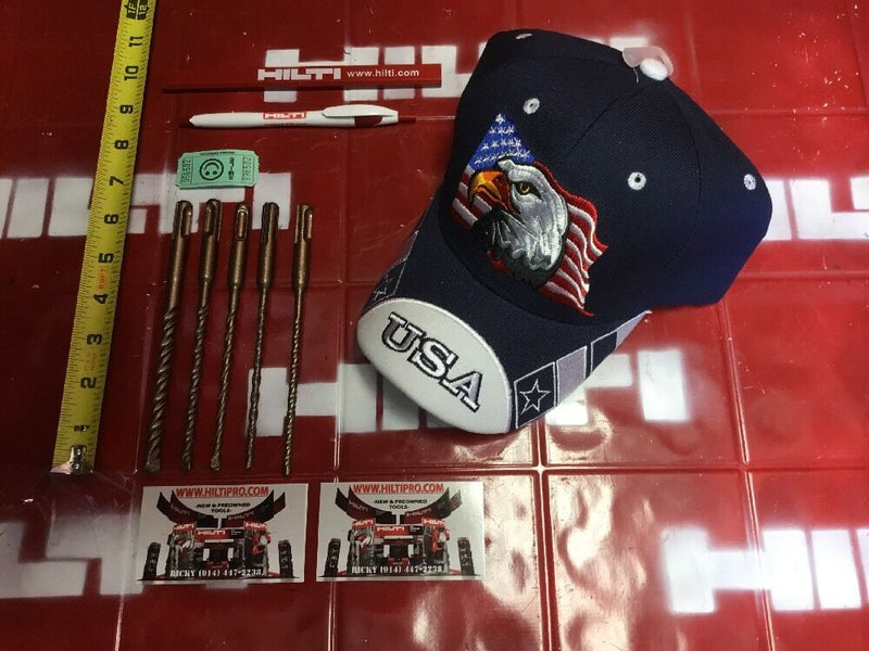 THIS HILTI SET OF 5 BITS IS PREOWNED, BUT GREAT CONDITION! I HAVE NEVER USED THESE BITS. IT HAS SOME LIGHT WEAR FROM BEING ON THE SHELF. BUT OTHERWISE THEY ARE PERFECT AND READY FOR USE. THESE BITS ARE HEAVY DUTY AND WILL LAST YOU A LONG TIME JUST LIKE ANY OTHER HILTI. WE ARE INCLUDING A FREE BRAND NEW HAT, PEN AND PENCIL!