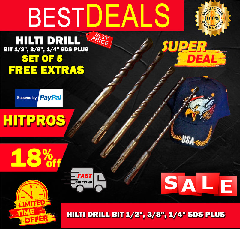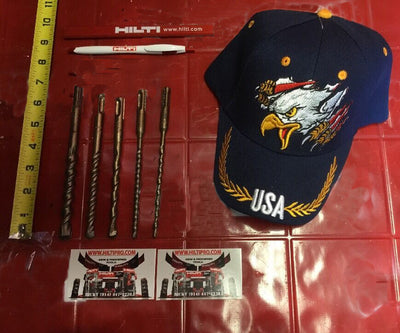 THIS HILTI SET OF 5 BITS IS PREOWNED, BUT IN MINT CONDITION! I HAVE NEVER USED THESE BITS. IT HAS SOME LIGHT WEAR FROM BEING ON THE SHELF. BUT OTHERWISE THEY ARE PERFECT AND READY FOR USE. THESE BITS ARE HEAVY DUTY AND WILL LAST YOU A LONG TIME JUST LIKE ANY OTHER HILTI. WE ARE INCLUDING A FREE BRAND NEW HAT, PEN AND PENCIL!