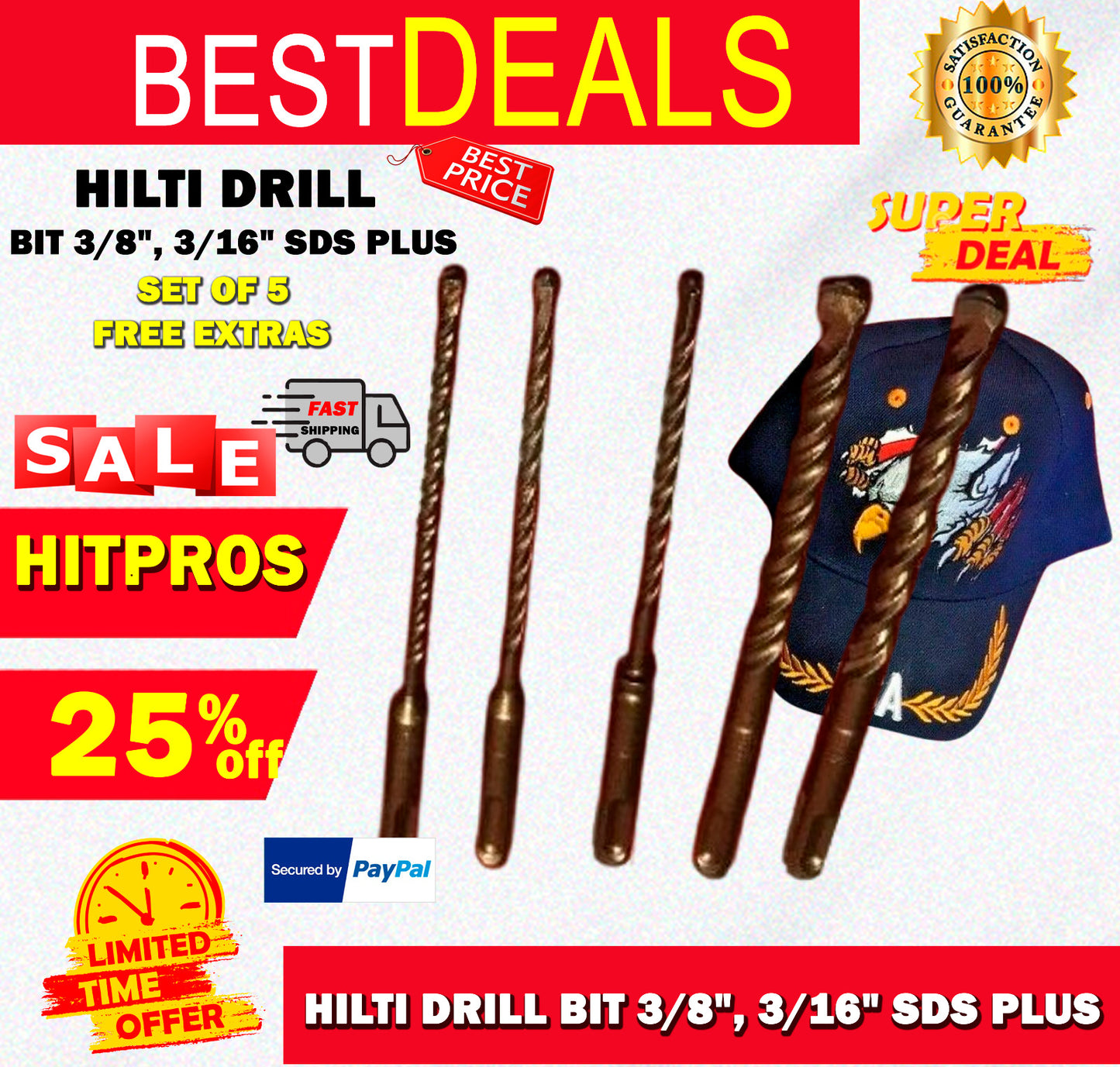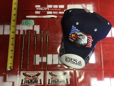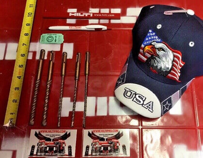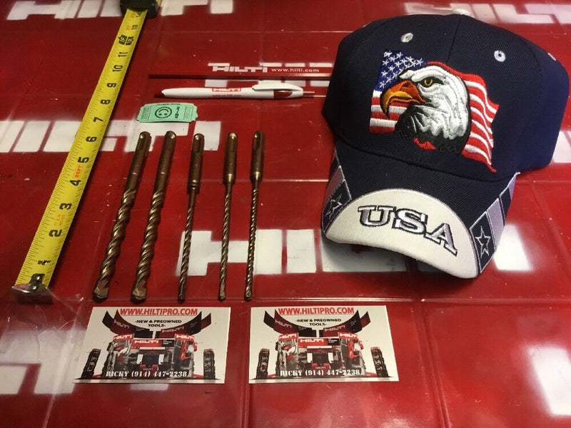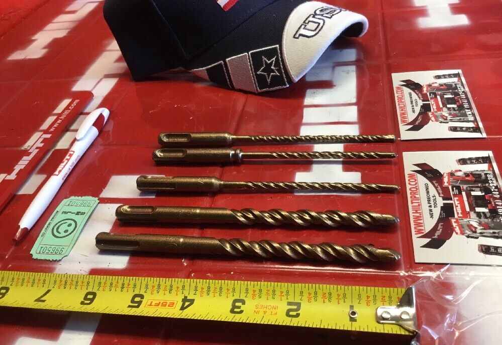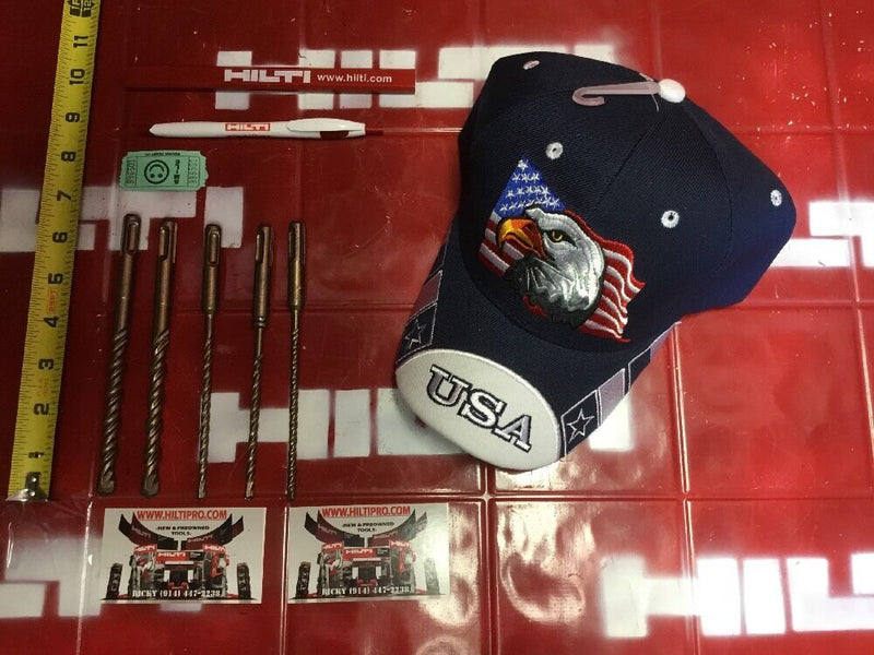 THIS HILTI SET OF 5 BITS IS PREOWNED, BUT IN MINT CONDITION! I HAVE NEVER USED THESE BITS. IT HAS SOME LIGHT WEAR FROM BEING ON THE SHELF. BUT OTHERWISE THEY ARE PERFECT AND READY FOR USE. THESE BITS ARE HEAVY DUTY AND WILL LAST YOU A LONG TIME JUST LIKE ANY OTHER HILTI. WE ARE INCLUDING A FREE BRAND NEW HAT, PEN AND PENCIL!