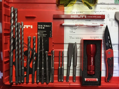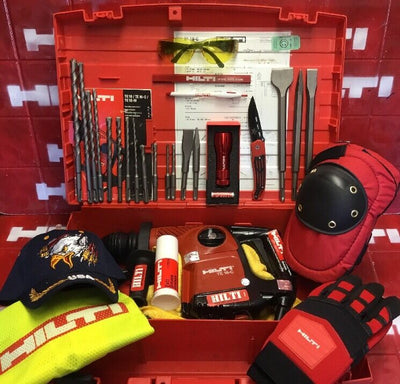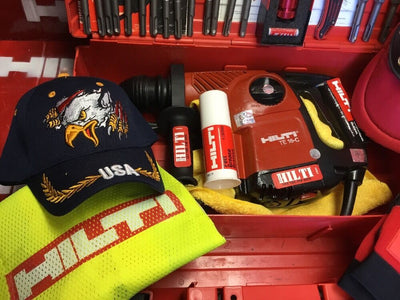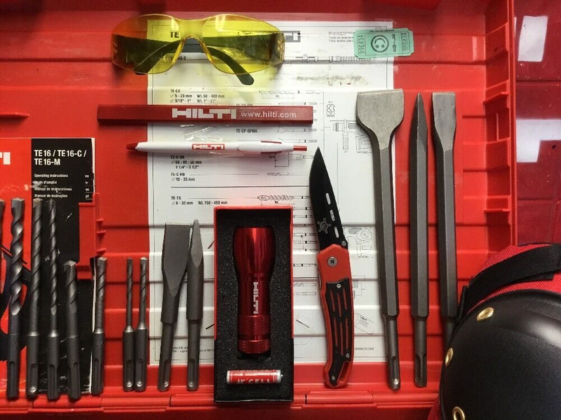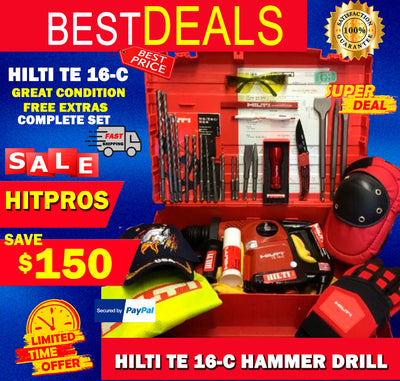HILTI TE 16-C HAMMER DRILL THIS HILTI IS IN GREAT CONDITION. AS YOU CAN SEE IN THE PICTURES THIS HILTI TE 16-C LOOKS NEW, AND WORKS LIKE NEW. THIS SET INCLUDES FREE SET PF BITS AND CHISELS SO YOU CAN GET THE JOB STARTED AS SOON AS YOU RECEIVE YOUR HILTI. YOU WILL RECEIVE THE FOLLOWING FOR FREE: 1 BIT 3/16 X 4-1/4" 1 BIT 1/4 X 4-1/4" 1 BIT 5/16 X 4-1/4" 1 BIT 3/8 X 4-1/4" 1 BIT 1/4 X 6-1/4" 1 BIT 5/16 X 6-1/4" 1 BIT 3/8 X 6-1/4" 1 BIT 1/2 X 6-1/4" 1 BIT 5/16 X 8-1/4" 1 BIT 3/8 X 8-1/4" 1 BIT 1/2 X 10-1/4" 1 BIT 9/16 X 10-1/4" 1 SHORT CHISEL FLAT 5-1/2" 1 SHORT CHISEL POINTED 5-1/2" 1 CHISEL FLAT 3/4" X 10" 1 CHISEL WIDE 1-1/2" X 10" 1 CHISEL POINTED 10" SAFETY VEST |
