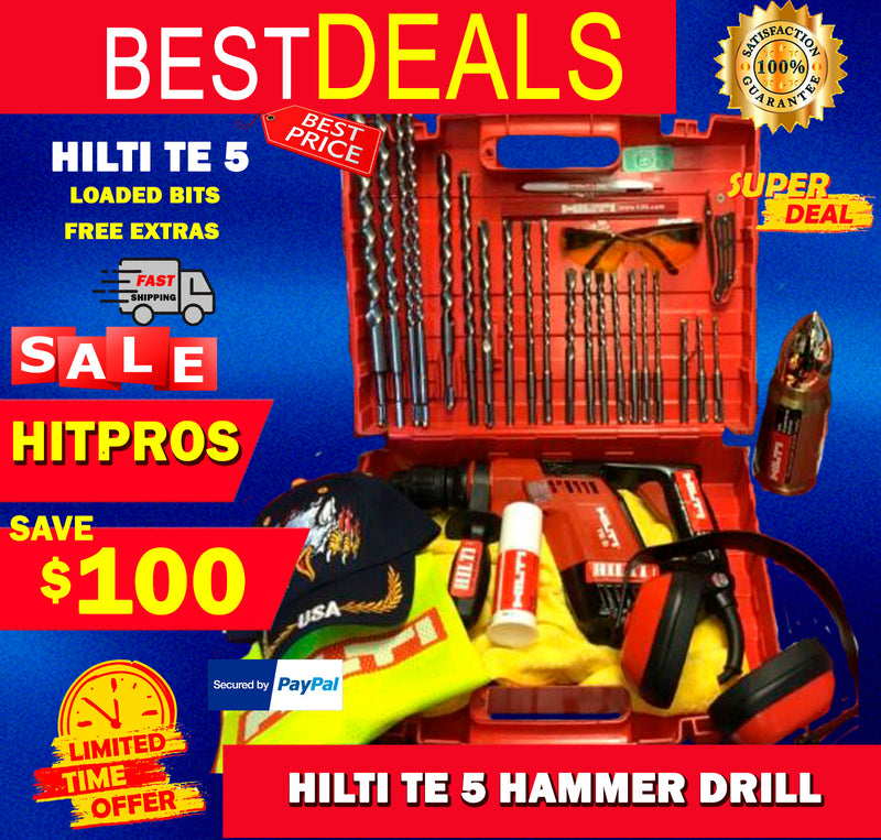 HILTI TE 5 HAMMER DRILL IN EXCELLENT CONDITION, MADE IN GERMANY TE 5 HAS BEEN AMONG THE CUSTOMERS FAVORITES TO GET YOU UP STARTED WE WILL INCLUDE A FREE SET OF BITS YOU WILL RECEIVE FREE ITEMS: 20 PCS SDS PLUS DRILL BIT SPECIFICATION: - 1 PC EACH: 5 X 4-1/4", 6 X 4-1/4", 8 X 4-1/4" - 2 PCS EACH: 6 X 6-1/4", 8 X 6-1/4", 10 X 6-1/4" - 1 PC EACH: 12 X 6-1/4" - 1 PC EACH: 8 X 8-1/4", 10 X 8-1/4", 12 X 8-1/4", 14 X 8-1/4" - 1 PC EACH: 14 X 10-1/4", 16 X 10-1/4" - 1 PC EACH: 10 X 18", 12 X 18", 16 X 18", 20 X 18"SAFETY VEST HILTI THERMO |