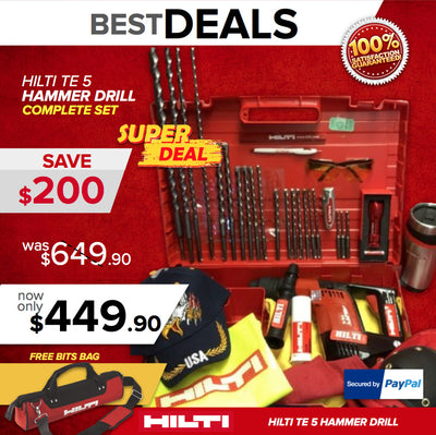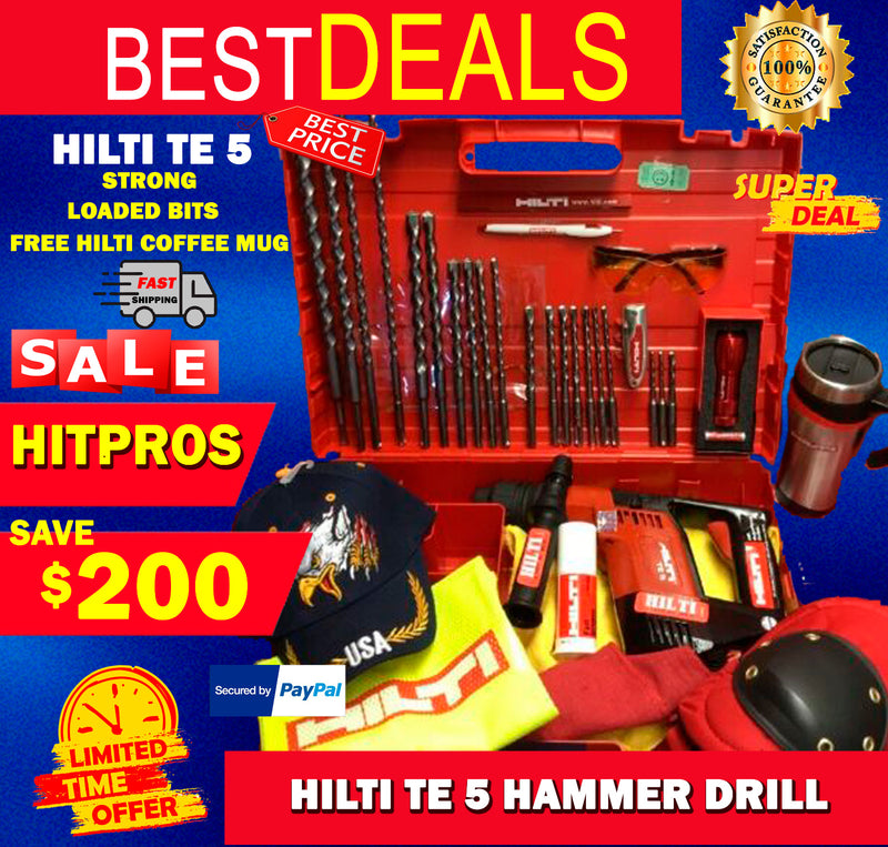 HILTI TE 5 HAMMER DRILL IN EXCELLENT CONDITION, MADE IN GERMANY TE 5 HAS BEEN AMONG THE CUSTOMERS FAVORITES TO GET YOU UP STARTED WE WILL INCLUDE A FREE SET OF BITS YOU WILL RECEIVE FREE ITEMS: 20 PCS SDS PLUS DRILL BIT SPECIFICATION: - 1 PC EACH: 5 X 4-1/4", 6 X 4-1/4", 8 X 4-1/4" - 2 PCS EACH: 6 X 6-1/4", 8 X 6-1/4", 10 X 6-1/4" - 1 PC EACH: 12 X 6-1/4" - 1 PC EACH: 8 X 8-1/4", 10 X 8-1/4", 12 X 8-1/4", 14 X 8-1/4" - 1 PC EACH: 14 X 10-1/4", 16 X 10-1/4" - 1 PC EACH: 10 X 18", 12 X 18", 16 X 18", 20 X 18"SAFETY VEST HILTI COFFE MUG KNEE PADS HILTI LED FLASHLIGHT HILTI GREASE HILTI KNIFE HILTI PEN AND PENCIL SAFETY GLASSES HAT >>>>WHAT YOU SEE IS WHAT YOU GET<<<< ))))))))))BUYER IS RESPONSIBLE FOR READING AND UNDERSTANDING ALL POLICIES(((((((( YOU CAN BUY WITH CONFIDENCE, 100% SATISFACTION OR YOUR MONEY BACK. PLEASE FEEL FREE TO ASK ANY QUESTION OR CONCERNS. WE WILL GLADLY ANSWER. PAYMENTS: PayPal PAYMENTS MUST BE MADE WITHIN 4 DAYS AFTER THE PURCHASE. IF PAYMENT IS NOT MADE AFTER 4 DAYS, WE WILL NOTIFY EBAY FOR NON PAYMENT AND RELIST THE ITEM. SHIPPING: WE ONLY SHIP TO CONFIRMED ADDRESSES, SHIPMENTS TO P.O BOXES WILL BE CHARGED AN EXTRA $10. SHIPPING PRICE LISTED IS FOR THE THE 48 US CONTIGUOUS STATES ONLY. PLEASE CONTACT US PRIOR TO PURCHASE IF YOU LIVE OUTSIDE THE CONTINENTAL US (SHIPPING PRICES MAY VARY). SHIPMENTS ARE MADE QUICKLY AFTER ITEM IS PAID. INTERNATIONAL SHIPMENT THE BUYER WILL BE RESPONSIBLE TO PAY ALL THE DUTIES IN THEIR COUNTRIES. FEEDBACK: WE WILL LEAVE POSITIVE FEEDBACK FOR ALL SMOOTH TRANSACTIONS, WE ASK FOR THE SAME IN RETURN. WE DO OUR BEST TO DESCRIBE THE ITEM. OUR GOAL IS TO MAKE YOUR SHOPPING EXPERIENCE A GREAT ONE. WE WILL LEAVE FEEDBACK AS SOON AS FEEDBACK IS LEFT FOR US. RETURNS: IF YOU ARE NOT COMPLETELY SATISFIED WITHIN 14 DAYS AFTER YOU RECEIVE THE ITEM, PLEASE CONTACT US AND RETURN THE ITEM FOR A FULL REFUND, MINUS THE SHIPPING COST. ( NO QUESTIONS ASKED) NO REFUND UNTIL ITEM IS RETURNED. REMINDER: PLEASE, DO NOT ASSUME ANYTHING. IF IT IS NOT SHOWN IN PICTURES OR WRITTEN IN THE DESCRIPTION, CHANCES ARE IT IS NOT INCLUDED! AGAIN, IF YOU UNSURE OF ANYTHING, PLEASE FEEL FREE TO CONTACT US AT (914) 447 - 2238 IF YOU HAVE PURCHASED AND HAVE ANY ISSUES, PLEASE DO NOT FILE A DISPUTE OR LEAVE A NEGATIVE FEEDBACK BEFORE CONTACTING US FIRST. I GUARANTEE A RESPONSE TO YOUR EMAIL OR PHONE CALL. WE WILL RESOLVE ANY ISSUES YOU MAY HAVE. A $25.00 RESTOCKING FEE WILL BE CHARGED FOR ANY BUYERS THAT BACK OUT OF A PURCHASE WITHOUT A GOOD REASON. ((((((((((((( INTERNATIONAL BUYERS )))))))))))))))) PRIOR TO PURCHASE, PLEASE EMAIL US TO CHECK HOW MUCH THE SHIPPING COST ARE FIRST , WE WILL GET THE BEST PRICE OF SHIPPING TO ANY COUNTRY, THANKS. >>>PLEASE VISIT OUR STORE AT WWW,HILTIMASTER,COM< CHECK OUT MY FEEDBACK AND BID WITH CONFIDENCE!! PLEASE CLICK TO SEE MY OTHER AUCTIONS AND ADDITIONAL ITEMS IN MY EBAY STORE. ((((((((((((( ? INTERNATIONAL BUYERS ? )))))))))))))))) >>>>>WE DO NOT SHIP TO SOUTH AMERICA (BRAZIL, PERU, VENEZUELA, ETC.)<<<<