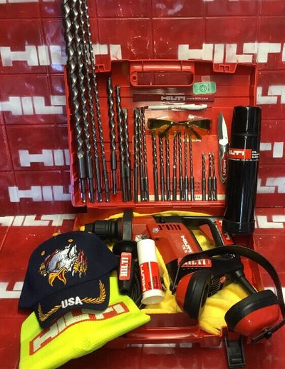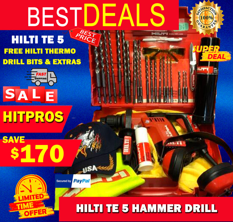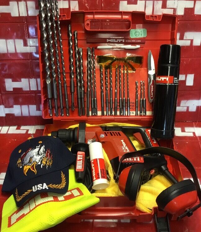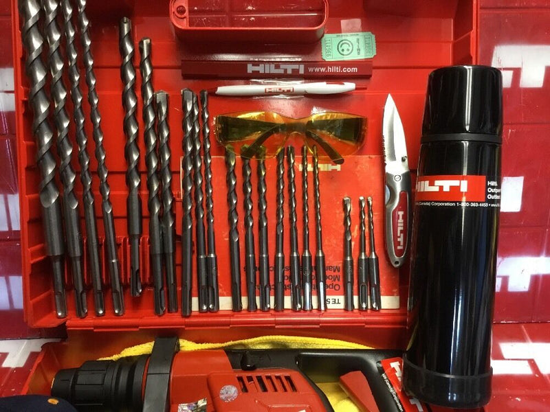 HILTI TE 5 HAMMER DRILL IN EXCELLENT CONDITION, MADE IN GERMANY TE 5 HAS BEEN AMONG THE CUSTOMERS FAVORITES TO GET YOU UP STARTED WE WILL INCLUDE A FREE SET OF BITS YOU WILL RECEIVE FREE ITEMS: 20 PCS SDS PLUS DRILL BIT SPECIFICATION: - 1 PC EACH: 5 X 4-1/4", 6 X 4-1/4", 8 X 4-1/4" - 2 PCS EACH: 6 X 6-1/4", 8 X 6-1/4", 10 X 6-1/4" - 1 PC EACH: 12 X 6-1/4" - 1 PC EACH: 8 X 8-1/4", 10 X 8-1/4", 12 X 8-1/4", 14 X 8-1/4" - 1 PC EACH: 14 X 10-1/4", 16 X 10-1/4" - 1 PC EACH: 10 X 18", 12 X 18", 16 X 18", 20 X 18" HILTI THERMO |