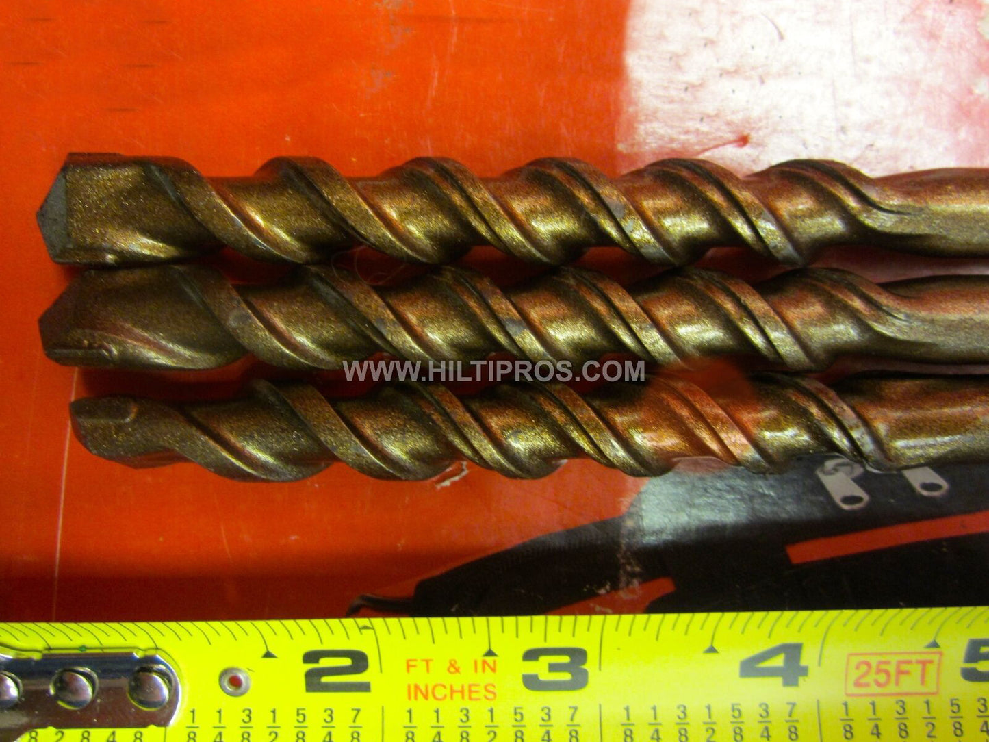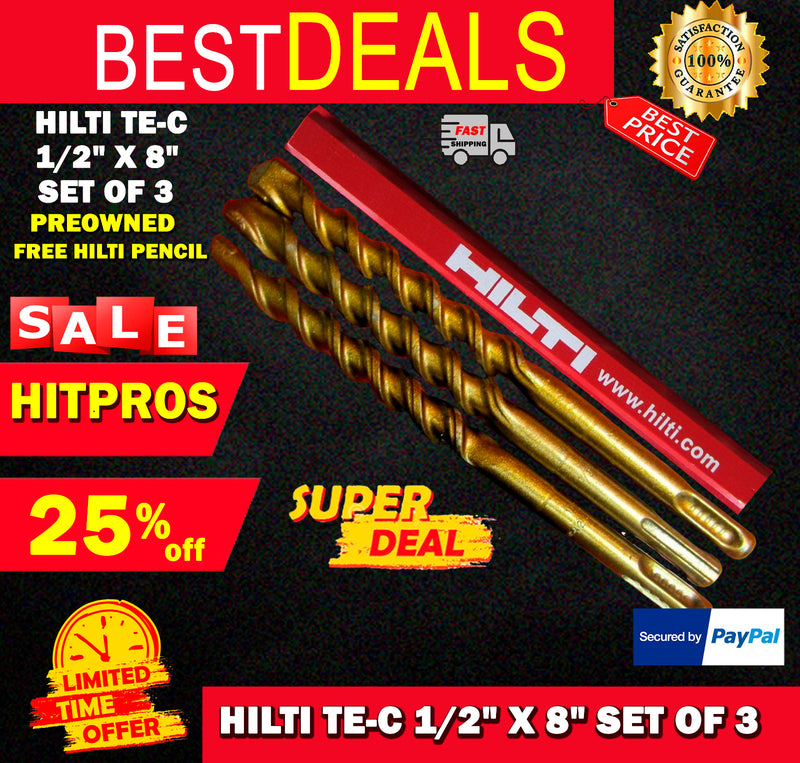 THIS HILTI SET OF 3 BITS IS PREOWNED, BUT IN GREAT CONDITION! I HAVE NEVER USED THESE BITS. IT HAS SOME LIGHT WEAR FROM BEING ON THE SHELF. BUT OTHERWISE THEY ARE PERFECT AND READY FOR USE. THESE BITS ARE HEAVY DUTY AND WILL LAST YOU A LONG TIME JUST LIKE ANY OTHER HILTI. WE ARE INCLUDING A FREE BRAND NEW HILTI PENCIL!